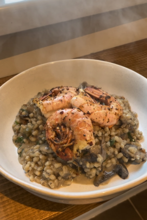 Mushroom pearl barley risotto with spicy prawns - serves 2