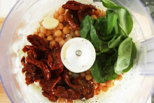 3. Add in the washed & drained chickpeas, drained sun-dried tomatoes, fresh basil, garlic clove, salt, pepper and chilli flakes. Whizz up until combined. Don't over blend or you'll end up with a puree.