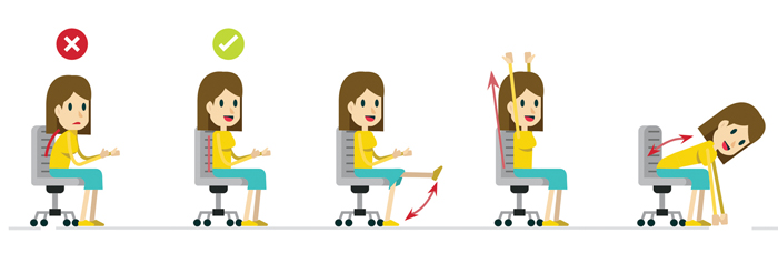 - Sit on the edge of your chair with your back straight. Hold onto the sides of your chair. Lift your right leg towards your chest as far as it will go then slowly lower it back to the ground. Repeat the movement with your left leg. Do 5 lifts with each leg.