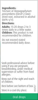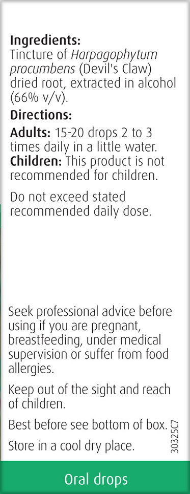 Tincture of Harpagophytum procumbens (Devil’s Claw) dried root, extracted in alcohol (66% v/v).