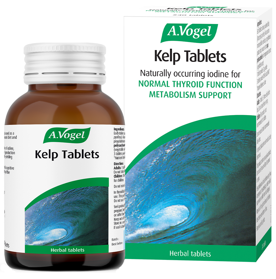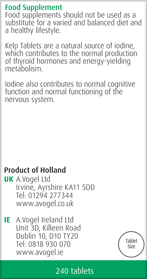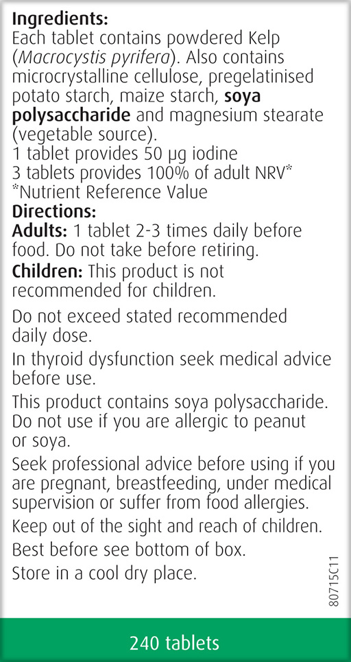 Each tablet contains powdered Kelp (Macrocystis pyrifera). Also contains microcrystalline cellulose, pregelatinised potato starch, maize starch, soya polysaccharide and magnesium stearate (vegetable source).