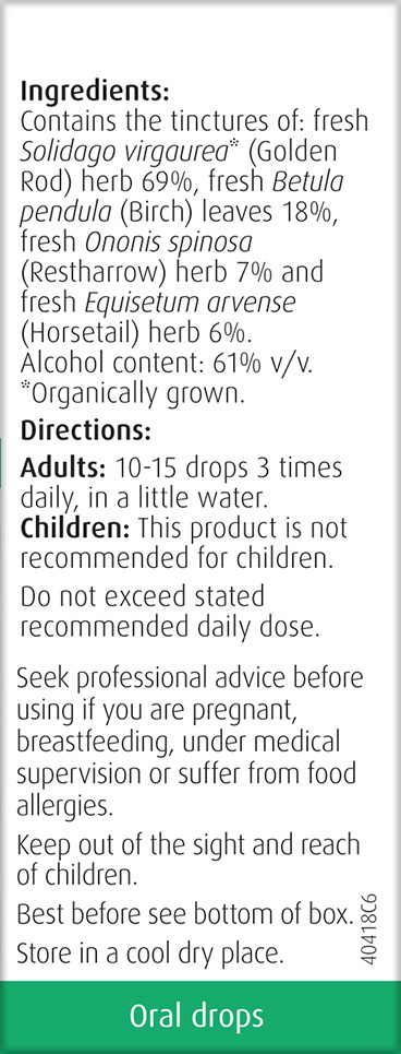 Contains the tinctures of fresh Solidago virguarea* (Golden Rod) herb 69%, fresh Betula pendula (Birch) leaves 18%, fresh Ononis spinosa (Restharrow) herb 7% and fresh Equisetum arvense (Horsetail) herb 6%.