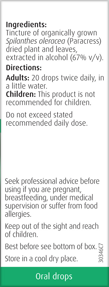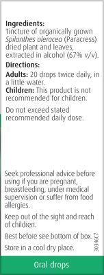 Tincture of organically grown Paracress(Spilanthes oleracea) dried plant and leaves, extracted in alcohol (67%V/V)