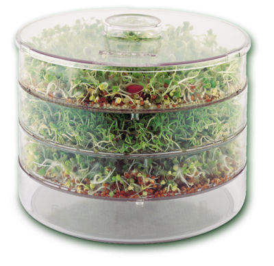 With the 3 tier sprouter, you will be able to ‘sow’ your sprouts at staggered intervals – starting every 2 or 3 days. This allows you to have a more consistent supply of sprouts. As one tray of sprouts is ready for harvesting, the others will contain seeds just starting to germinate.